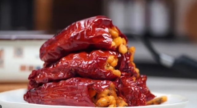 Накиснете сухите чушки във вода за 20 минути. След това ги отцедете и напълнете със бобената плънка. Подредете ги в гювеч и полейте с 2-3 черпака от водата, в която варихте боба. Затворете с капака на съда и поставете в студена фурна. Включете на 200 градуса и печете за 30 минути.