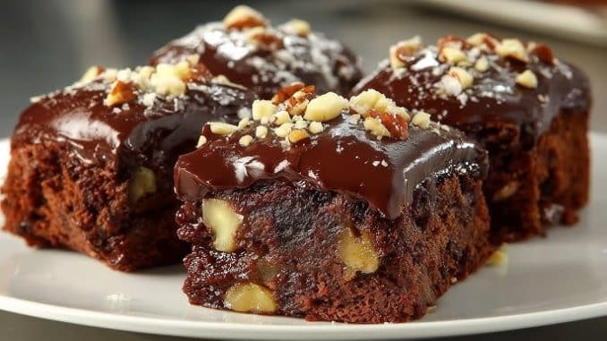 Направете шоколадовия топинг като начупите черния шоколад в купа. Полейте с горещото мляко и бъркайте до гладкост. Полейте десерта и поръсете с орехи. След това нарежете и поднесете.