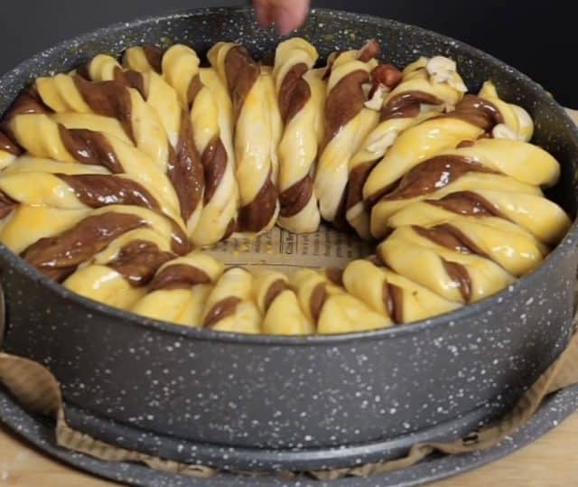 След като това стане, разбийте жълтъка и намажете. Поръсете с нарязнаи лешници или други ядки и поставете в предварително загрята до 180 градуса фурна. Печете за 30-35 минути или до златисто.
