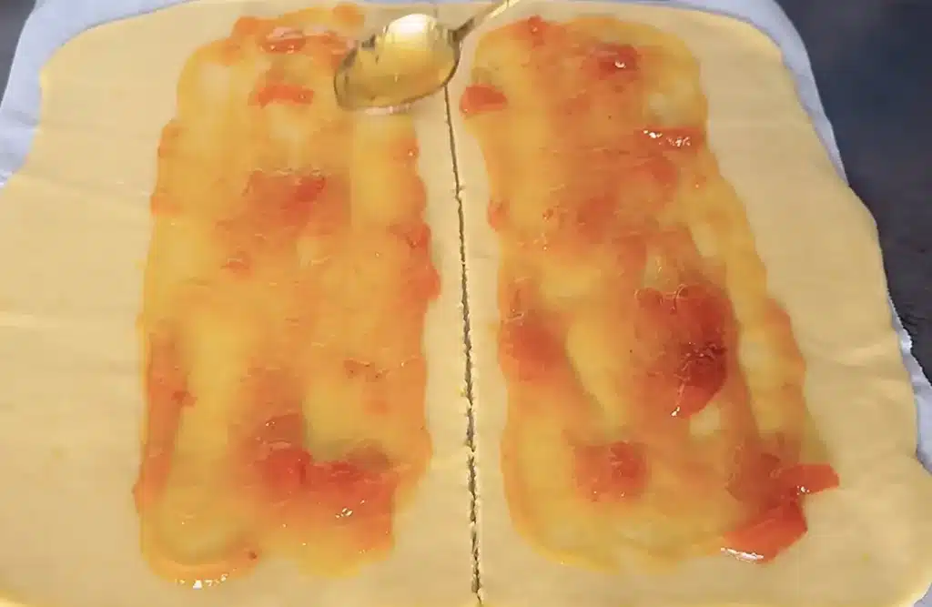 Оформете топка и сложете върху хартия за печене. Покрийте с друг лист хартия и разточете голяма правоъгълна кора. Срежете с нож през средата и намажете всяка половина със сладко от кайсии.