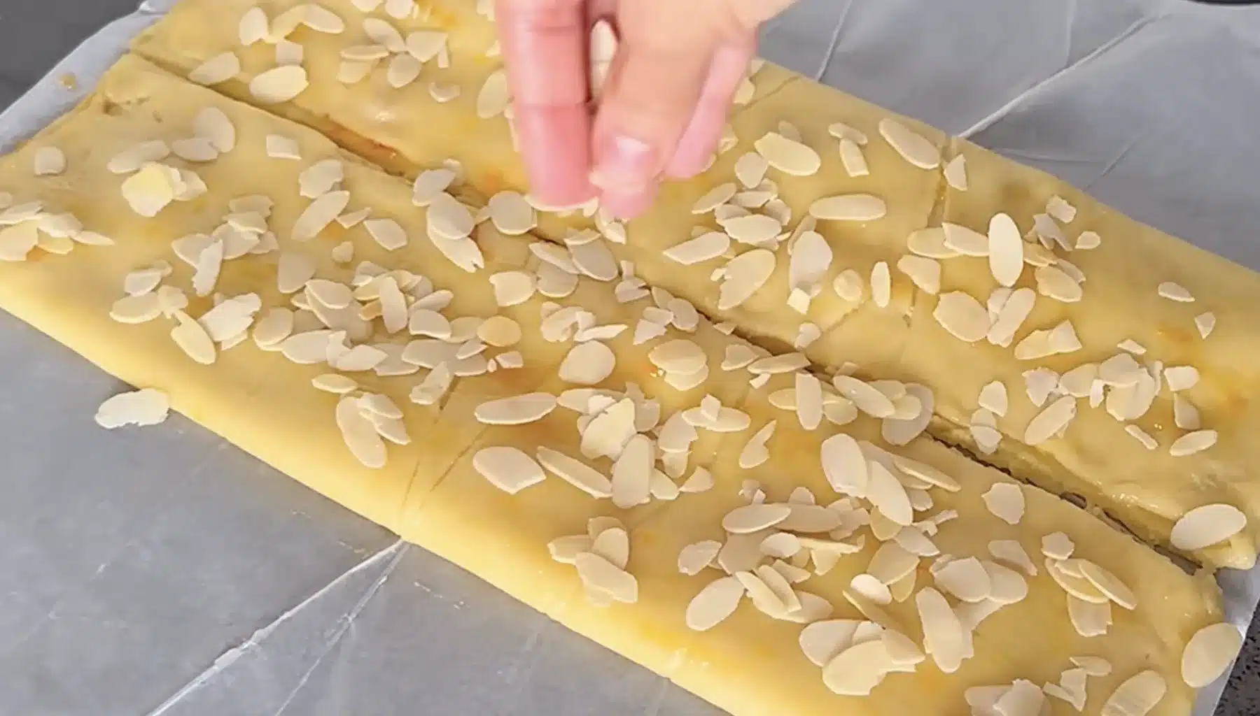 Сгънете всяка половинка през средата на две. С прусти настиснете добре краищата, за да не се отворят по време на печенето. Намажете отгоре всяко парче с малко сладко от кайсии и поръсете с филирани бадеми.
