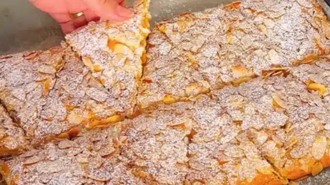 Поставете в предварително загрята до 175 градуса фурна и печете за 20 минути. Извадете и нарежете на триъгълници. Поръсете с пудра захар и подредете в съд за сервиране. След това поднесете.