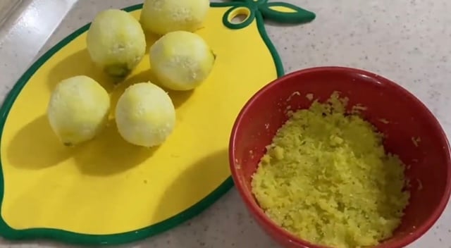 След като изсъхнат, настържете лимоновата кора на фината страна на рендето, чак до бялата част. Стържене само повърхностния слой, а бялата част оставете, защото е много горчива. Добавете пет супени лъжици кристална захар към настърганата кора и разбъркайте.