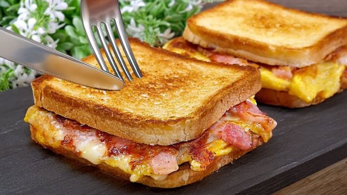 Сложете филиите хляб и запържете до златисто само от едната страна. След това извадете и сипете яйцето. След като се запечете добре от едната страна, поръсете с малко кашкавал. След това нарежете бекона на кубчета и поръсте над кашаквала. Сгънете като плик, обърнет еи печете за още 1-2 минути.