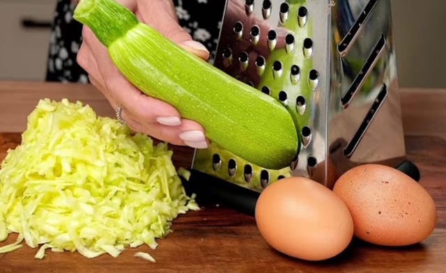 Настържете тиквичките, подправете с една чаена лъжичка сол и ги оставете да престоят 10 минути, за да си пуснат сока. След това отцедете излишната течност, като изстискате сока с ръце или с помощта на чиста кухненска кърпа.
