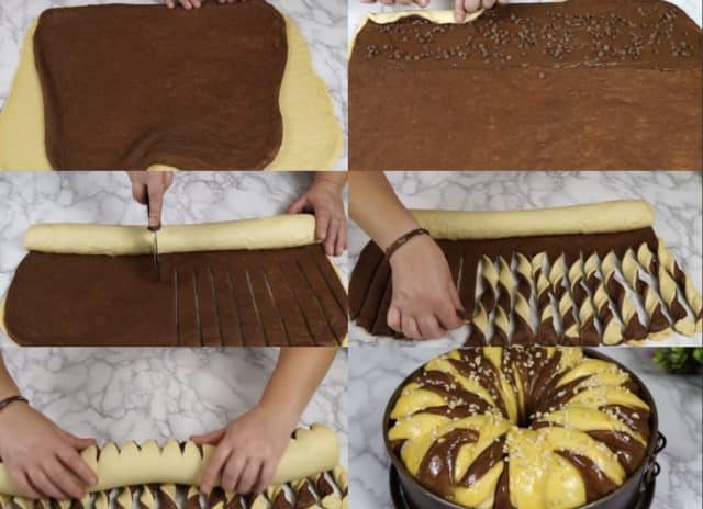 Оформете козунака, като върху набрашнена работна повърхност разточете бялото тесто на правоъгълник с размери приблизително 60 × 40 сантиметра. Направете същото с кафявото тесто, след което го поставете върху бялото.