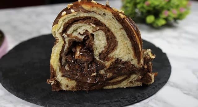Намажете с течния шоколад и поръсете с нарязания шоколад и навийте рулото наполовина. Нарежете другата част на ленти и усучете всяка.  След това продължете да навивате, докато се получи руло.