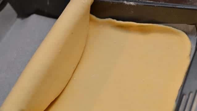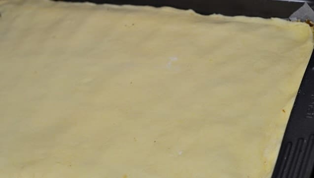 След това разделете тестото на 4 равни части. От всяка оформете топка и разточете тънка кора (с дължината на формата за печене).