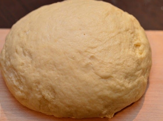 Разбийте яйцата със захарта. Добавете киселото мляко и разтопеното масло. Разбъркайте добре. Прибавете към брашното. Сложете маята и замесете меко тесто. Оставете тестото да почине за 3 минути.