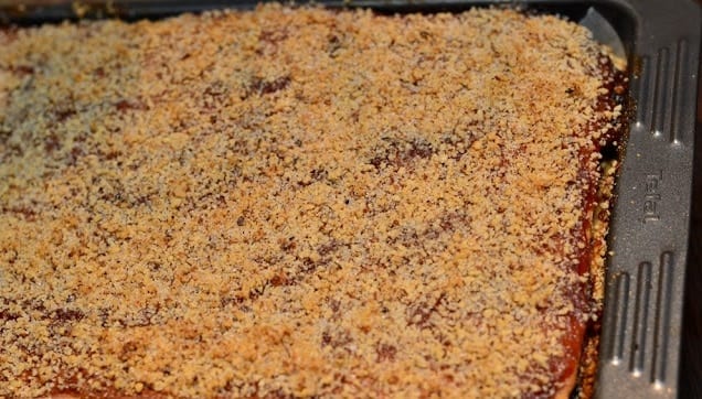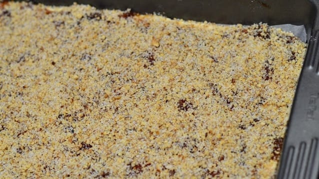 След това поставете в предварително загрята до 200 градуса фурна. Печете за 45 минути. Извадете и намажете с конфитюра и поръсете с орехи. Върнете във фурната и печете за още 15 минути.