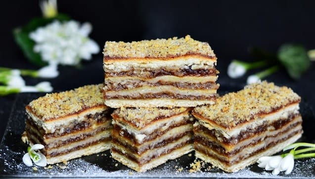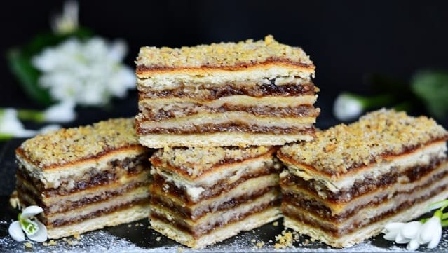 Покрийте форма за печене с хартия и сложете едната кората. Намажете с конфитюр и поръсете с орехите. Повторете с останалите кори. Последната кора не мажете с нищо. Оставете десерта на топло за 30 минути.