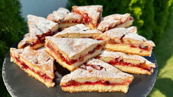 Извадете и оставете да се охлади напълно. След това махнете формата за печене и поставете в съд за сервиране. Нарежете на триъгълни парчета , поръсете с пудра захар и сервирайте.