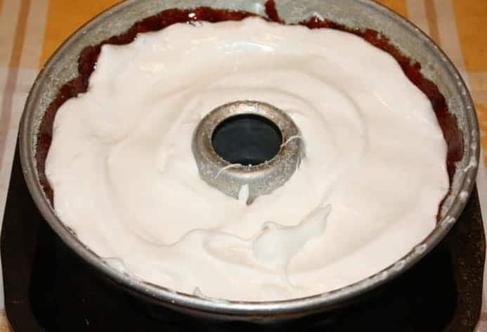 През това време пригответе крема, като смесите белтъците, захарта, ванилията, бадемовия екстракт и лимоновия сок. Разбийте с миксер на максимална скорост. Бийте до получаване на гъст бял крем с остри върхове (като за целувки).