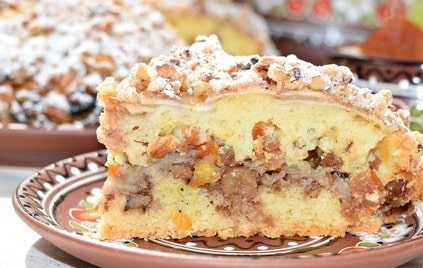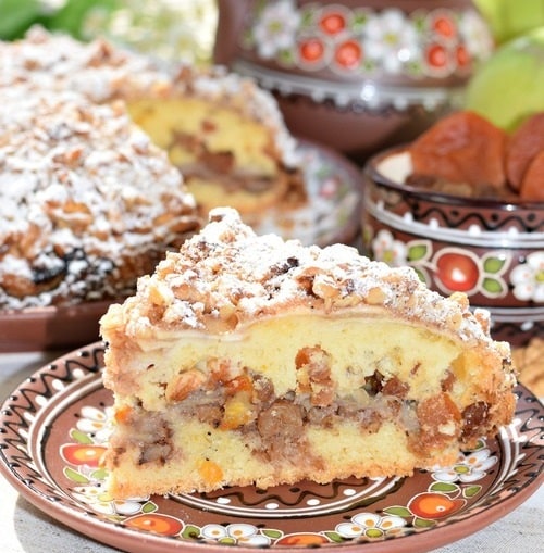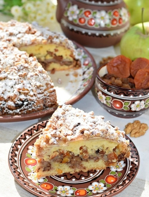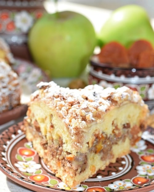 Вземете форма за печене и я намажете с малко олио. Поръсете с брашно и разклатете, за да се разпредели равномерно. Сипете 1/3 от тестото и загладете. Над него подредете част от орехите. Върху тях поставете половината от ябълките и над тях сложете половината от стафидите и кайсиите. Покрийте с малко от тестото и загладете. Направете още един пласт от ядки, ябълки, стафиди и кайсии. Накрая полейте с останалото тесто и загладете. Поръсете с останалите орехови ядки.