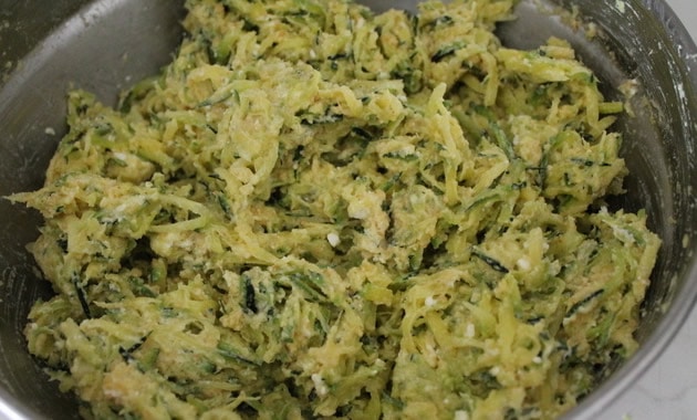 Измийте и настържете тиквичките. Посолете и оставете за 10 минути да си пуснат сока. След това отцедете добре. Почистете лука и чесъна и ги нарежете на ситно. Добавете към тиквичките. Сложете сиренето, яйцето, солта, черния пипер, брашно и галетата. Разбъркайте добре, докато съставките се комбинират и сместа стане хомогенна.