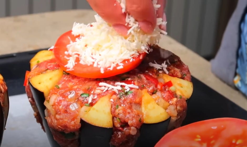 Покрийте форма за печене с хартия и намажете с малко олио. Сложете патладжаните в нея и напълнете с месната смес. Нарежете домата на кръгчета и над всеки патладжан поставете по резен домат. Настържете кашаквала на ситно ренде и поръсете патладаните. Поставете в предварително загрята до 180 градуса фурна и печете за 60 минути или до златисто кафява коричка.