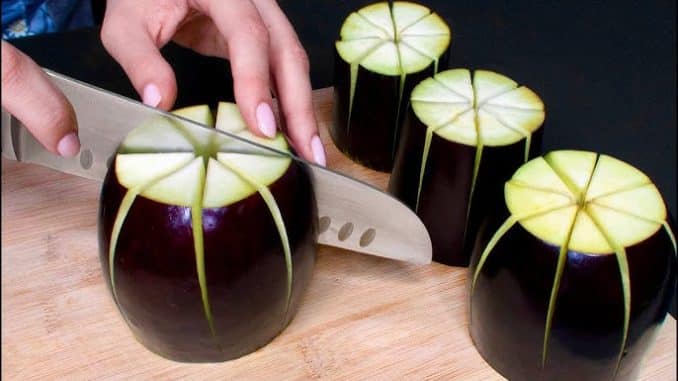 Измийте патладжаните и отрежете дръжките им. Срежете всеки на две. Вземете едната половина и откъм по-тесния край я разрежете на осмини, но не докрай (за да може да се отвори като цвете, но без да се разпада). Посолете патладжаните и оставете да си пуснат сока. След това измийте и подсушете.