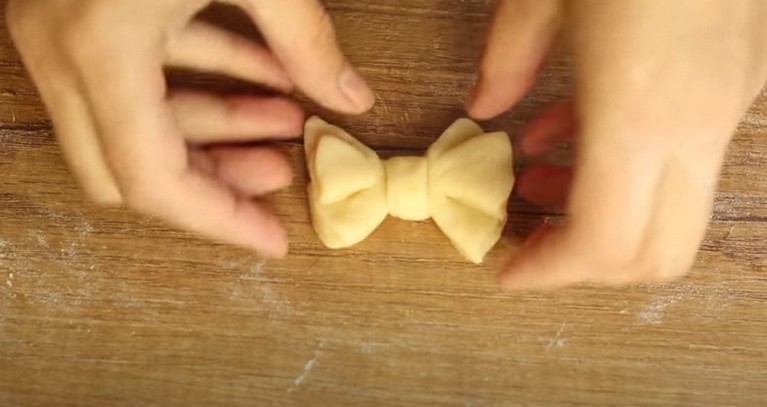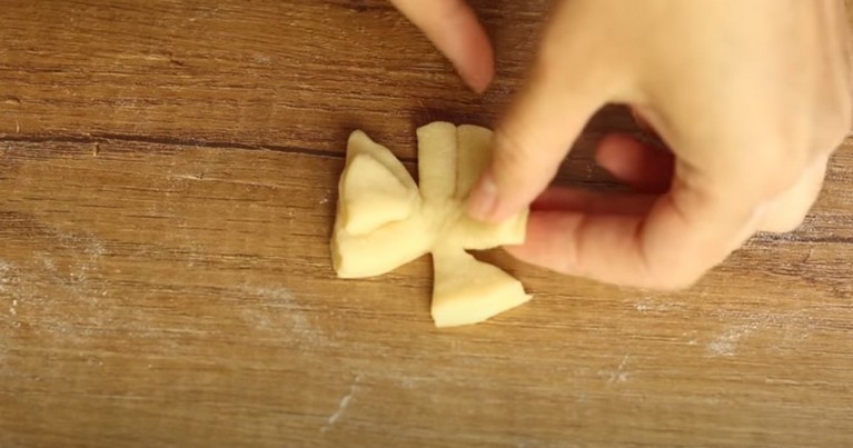 Оформете топка и върху набрашнена работна повърхност разточете кора с дебелина около 5 милиметра. С помощта на чаша (диаметър на гърлото 7 сантиметра) изрежете кръгчета.