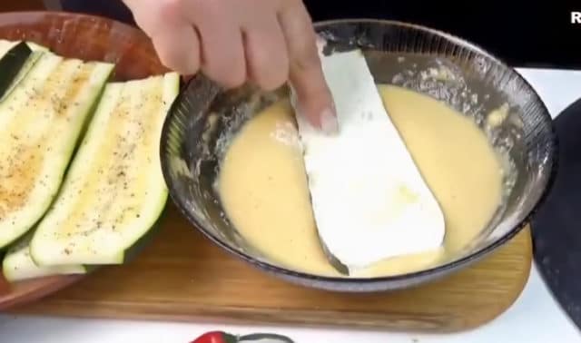Нарежете тиквичките на ленти с дебелина приблизително 5 милиметра. Подправете ги със сол и смлян черен пипер от двете страни.