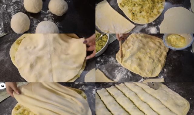 От всяка топка разточете тънка правоъгълна кора. Намажете първите пет с разтопен маргарин. Подредете ги една над друга, като разпределите плънката между тях. Най-отгоре сложете последната кора. Внимателно притиснете с длани и нарежете на ленти с ширина 2-3 сантиметра.