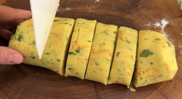 Настържете моркова и го запържете за кратко в малко растително масло. Добавете го към пюрето заедно с магданоза и разбъркайте добре. Сипете царевично нишесте и разбъркайте добре. След това оставете временно настрана.