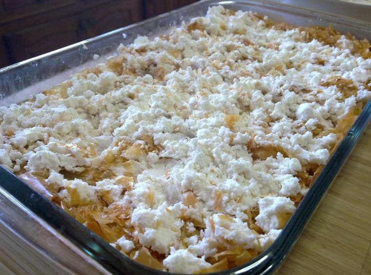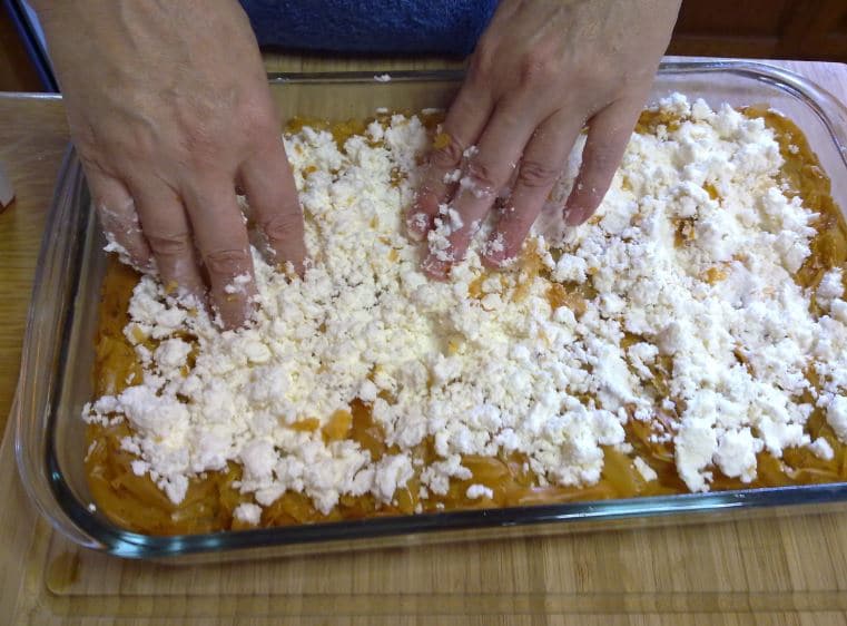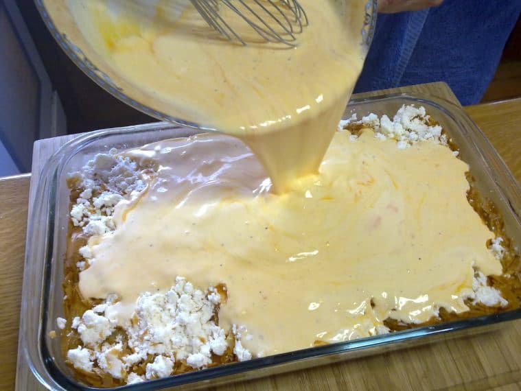 Извадете и поръсете с натрошеното краве сирене. В купа разбийте яйцата заедно с киселото мляко, заквасената сметана и черния пипер. Полейте баницата.