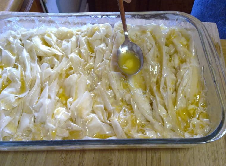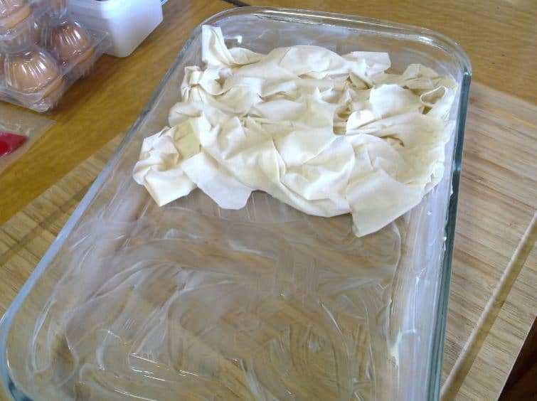 Поставете кравето масло в подходящ съд и сложете на котлона. Оставете да се разтопи. Върху работна повърхност поставете корите за баница. Вземете една и я нагънете като хармоника.