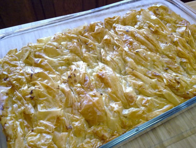 Намазнете правоъгълна форма за печене и поставете набраната кора в късия край. Навийте следващата кора и поставете до първата. Повторете с останалите кори. Полейте с кравето масло и поставете в предварително загрята до 200 градуса фурна. Печете за 20 минути или до златисто.