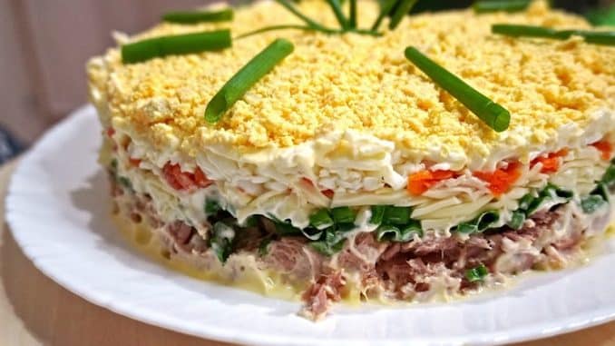 Над рибата разпределете равномерно зеления лук и след това покрийте с майонеза. Настържете кашкавала на едро ренде и направете нов плат. Покрийте го с майонеза и над нея подредете настърганите моркови. Направете ред от белтъците, посолете и поръсете с мелен черен пипер. Нанесете пласт майонеза и заравнете. Над нея поставете жълтъците и покрийте равномерно. Махнете ринга и декорирайте според вкуса си.