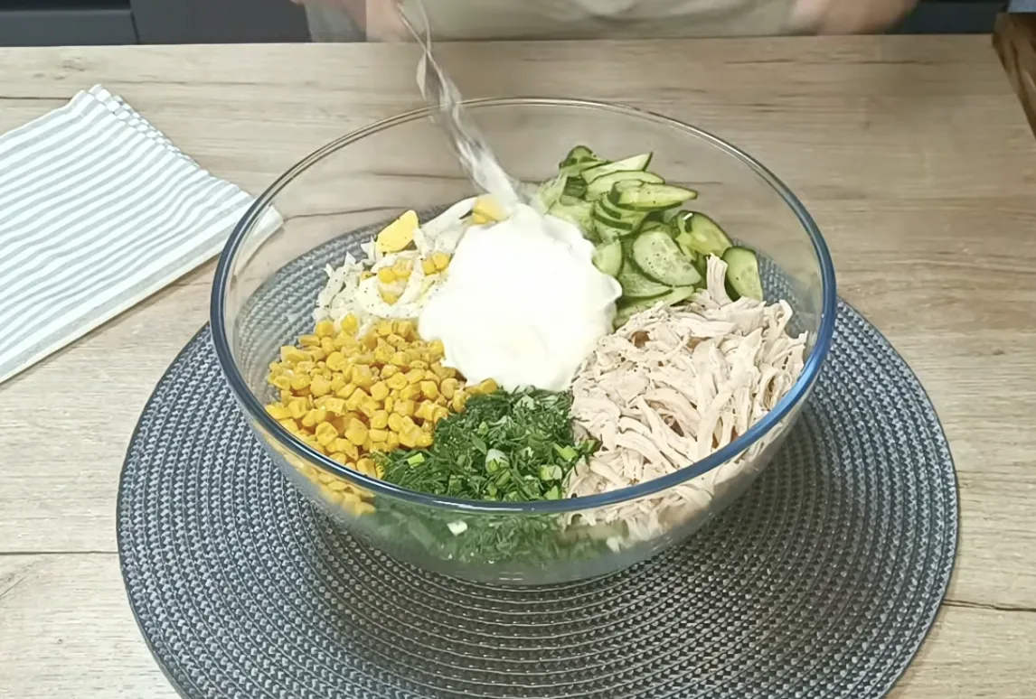 Добавете консервирана царевица. Направете дресинга, като в купа смесите заквсената сметана, зехтина и горчицата. Разбъркайте полейте салатата. Овкусете със сол и черен пипер и разбъркайте всичко добре.