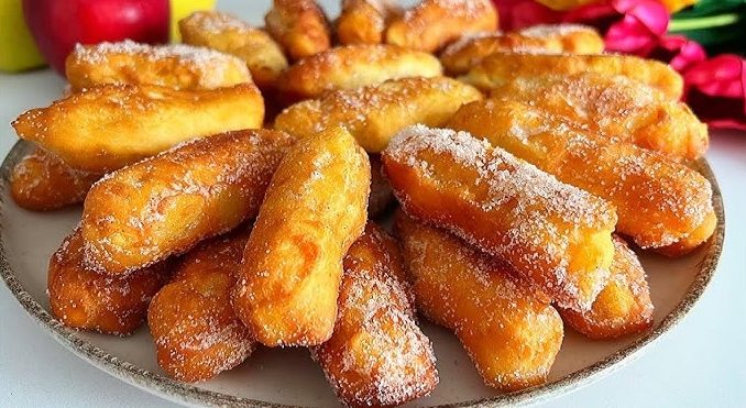 След това изпържете до златисто в предварително загрята олио. Смесете кристална захар и канелата и след това оваляйте. Подредете в съд за сервиране и поднесете.