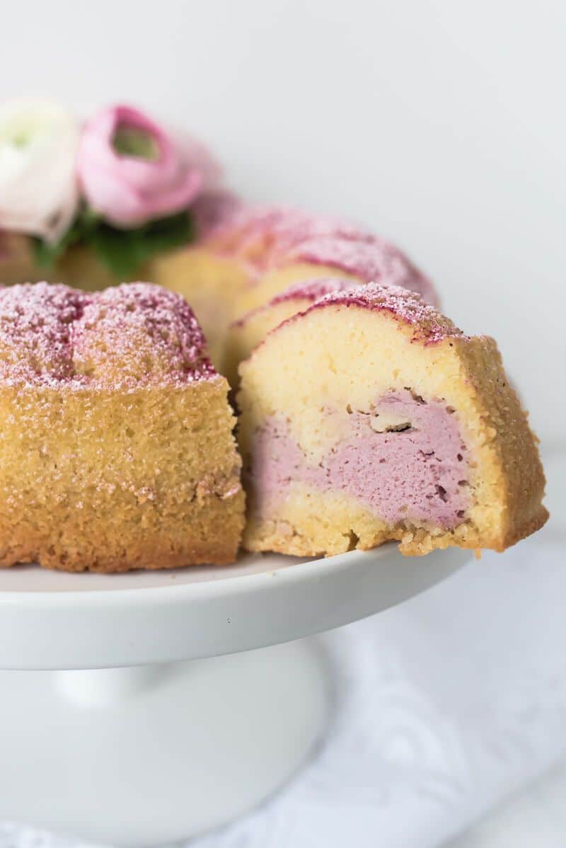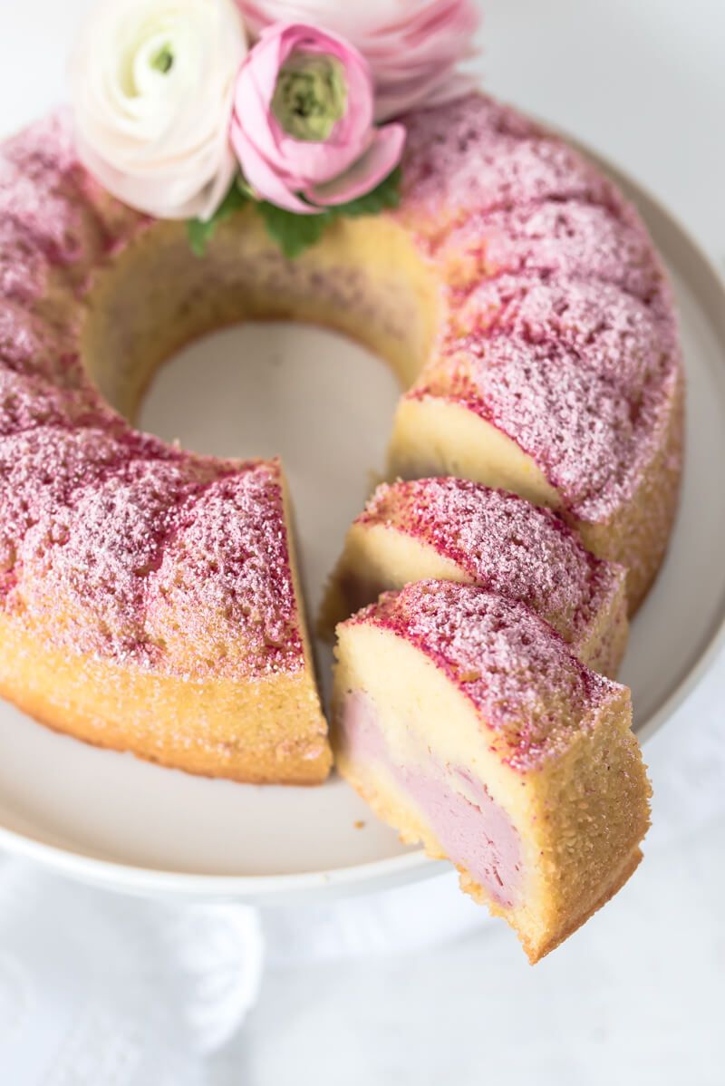 Извадете и оставете да се охлади напълно. Обърнете в съд за сервиране и премахнете формата за печене. Смесете пудрата и цветната захар и поръсете кексът.