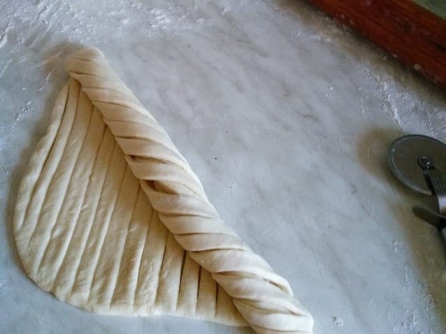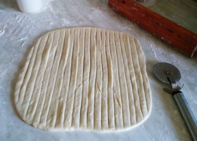 Вземете тестото и разделете на 2 неравни части. От по-малката разточете правоъгълна кора с дебелина около половин сантиметър. Вземете нож и нарежете на ленти от единия край до другия, като не срязвате кората до края. Вземете единия ъгъл и навийте кората по диагонал. След това завийте рулото на охлюв. Поставете върху хартия за печене.