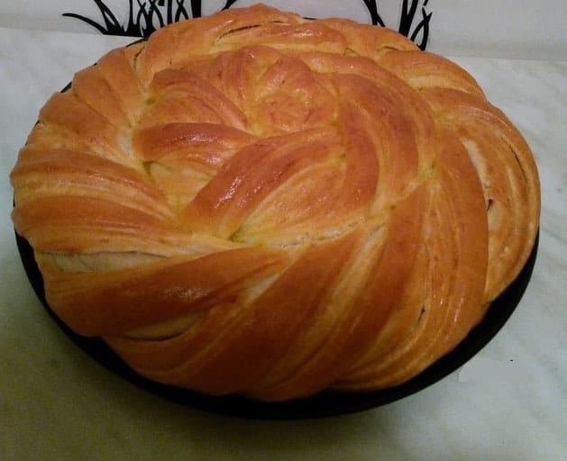 Същото направете и с по-голямото парче тесто. Увийте го около по-малкото и поставете заедно с хартията във форма за печене. Оставете на топло да удвои обема си.