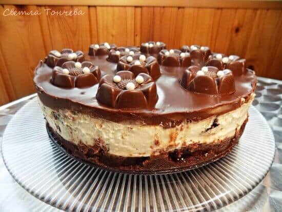 Когато десертът е готов, отстранявам ринга и украсявам. Режа и поднасям.