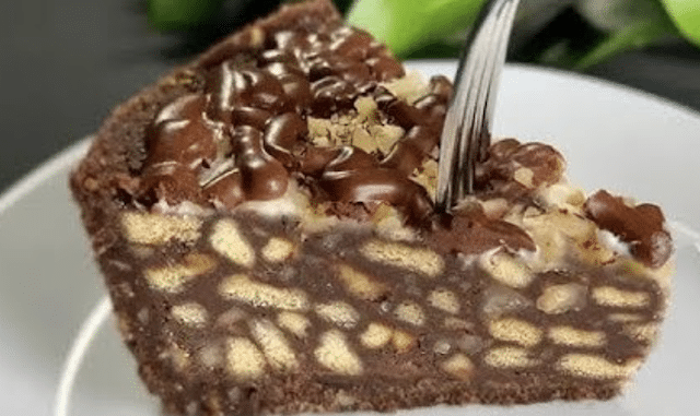 След като това стане полейте бисквитите в купата и разбъркайте за да се смесят добре. Вземете ринг и сложете в съд за сервиране. В него сипете бисквитената смес. С остър нож нарежете орехите и след това поръсете върху десерта, като разпределите равномерно.