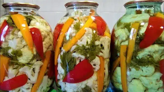 Вземете един буркан и на дъното му сложете листа магданоз, копър и целина. Сложете и по няколко скилидки чесън и по 8 броя зърна черен пипер. След това сложете по няколко резена чушки. След това напълнете с карфиол. Направете пласт от зелени подправки и сложете чушки и моркови. Напълнете отново с карфиол. Редувайте, докато съда се запълни.