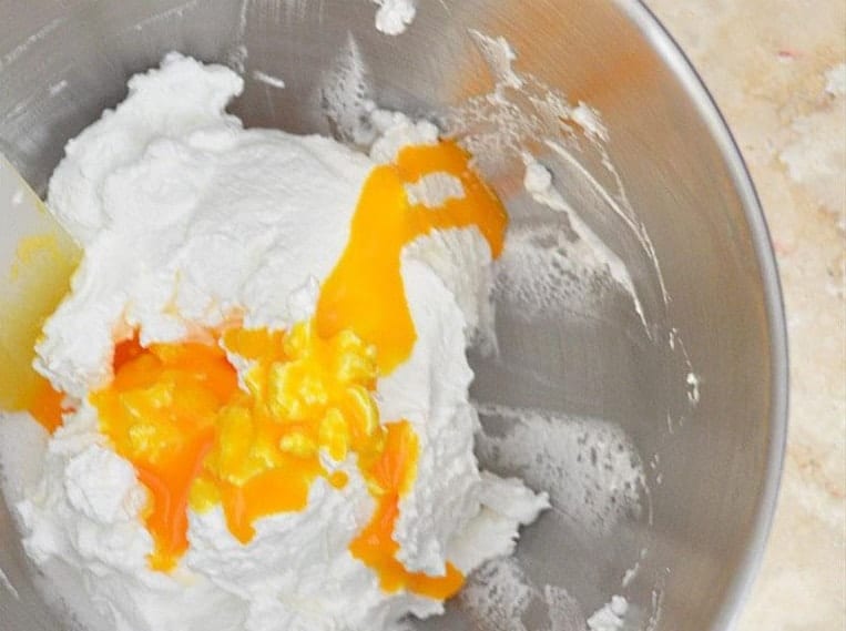 В отделен съд, с вилица, разбийте жълтъците. Добавете към белтъците и разбъркайте с шпатула. Бъркайте, докато сместа стане еднородна.