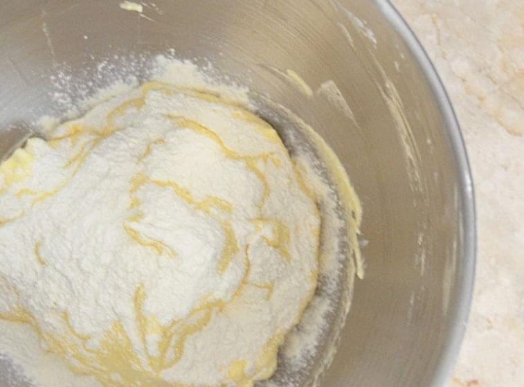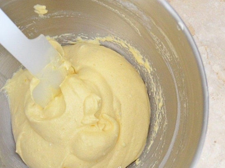 Пресейте брашното и добавете към яйчния крем. Отново с шпатула бъркайте, докато сместа стане хомогенна. По желание можете да прибавите и настърганата кора на 1/2 лимон.