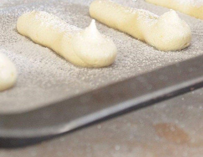 Поставете тестото в шприц с плосък накрайник и във форма за печене, покрита с хартия, оформете савоярдите. Поръсете с кристална захар (може и пудра захар).