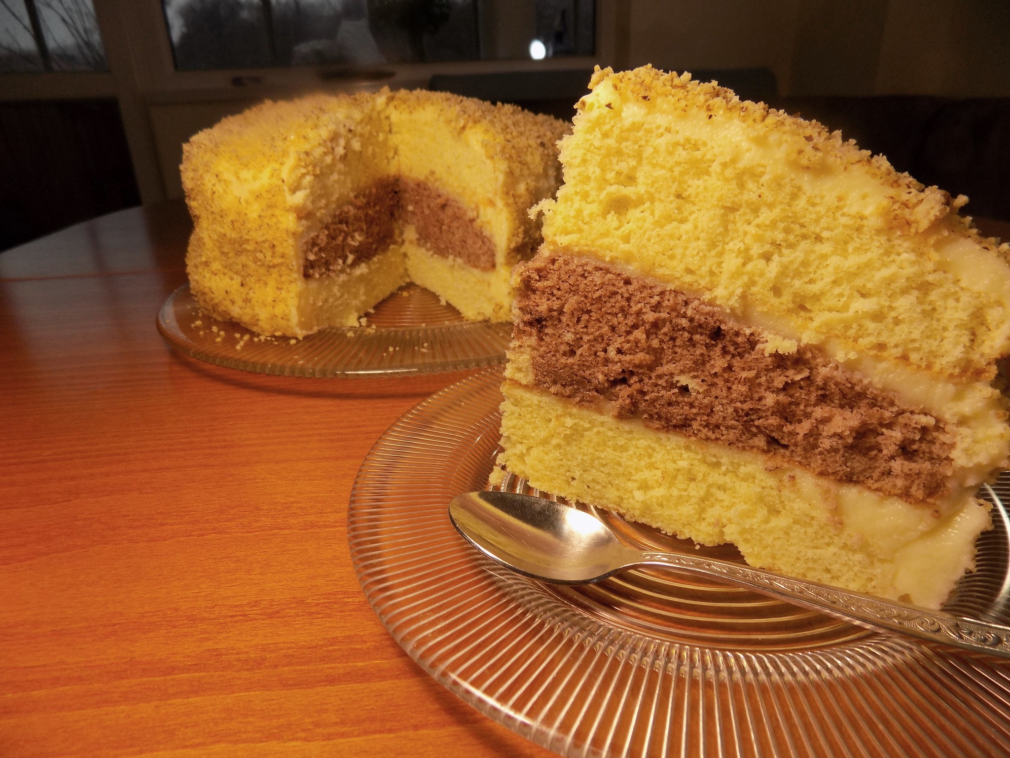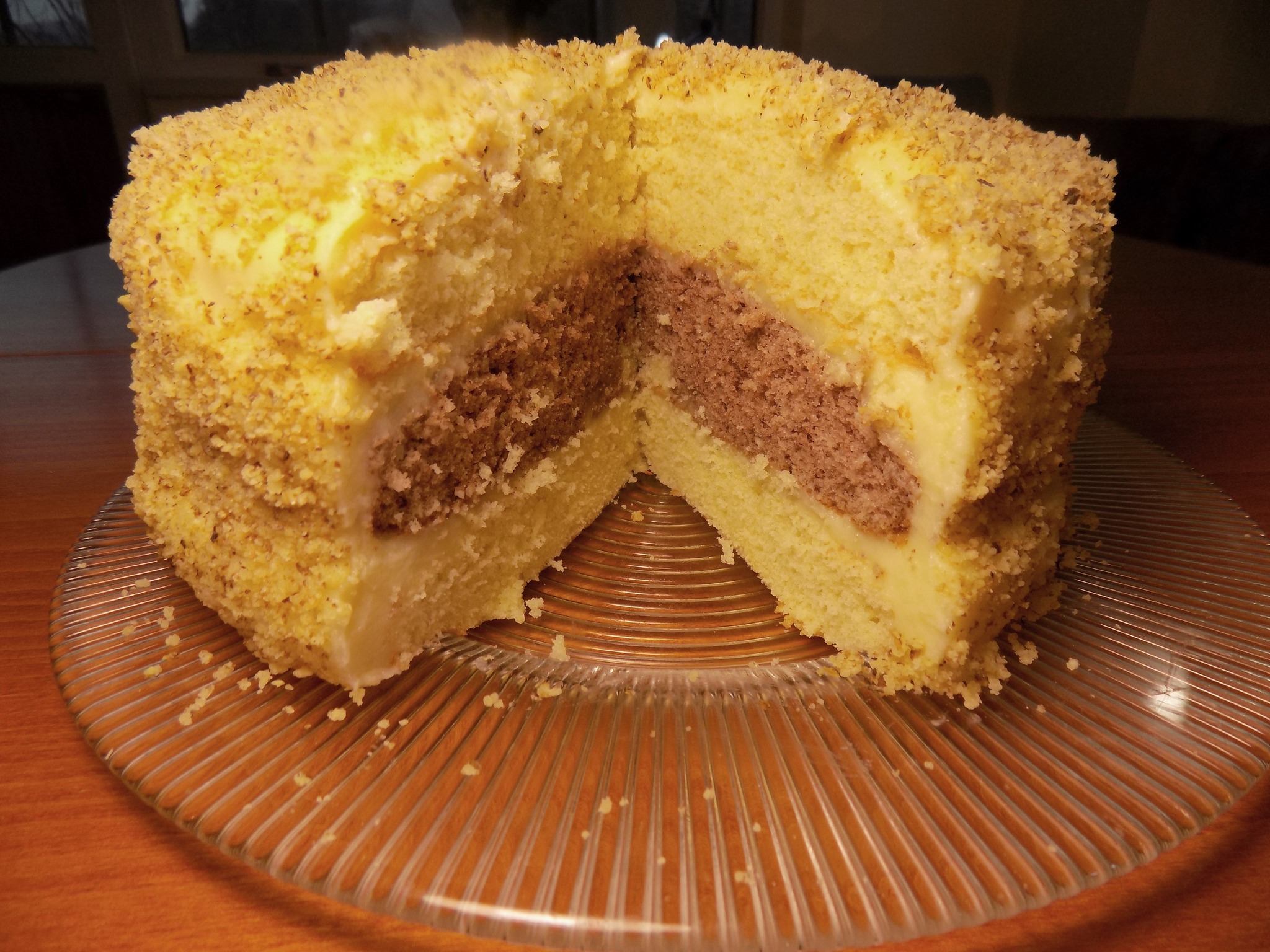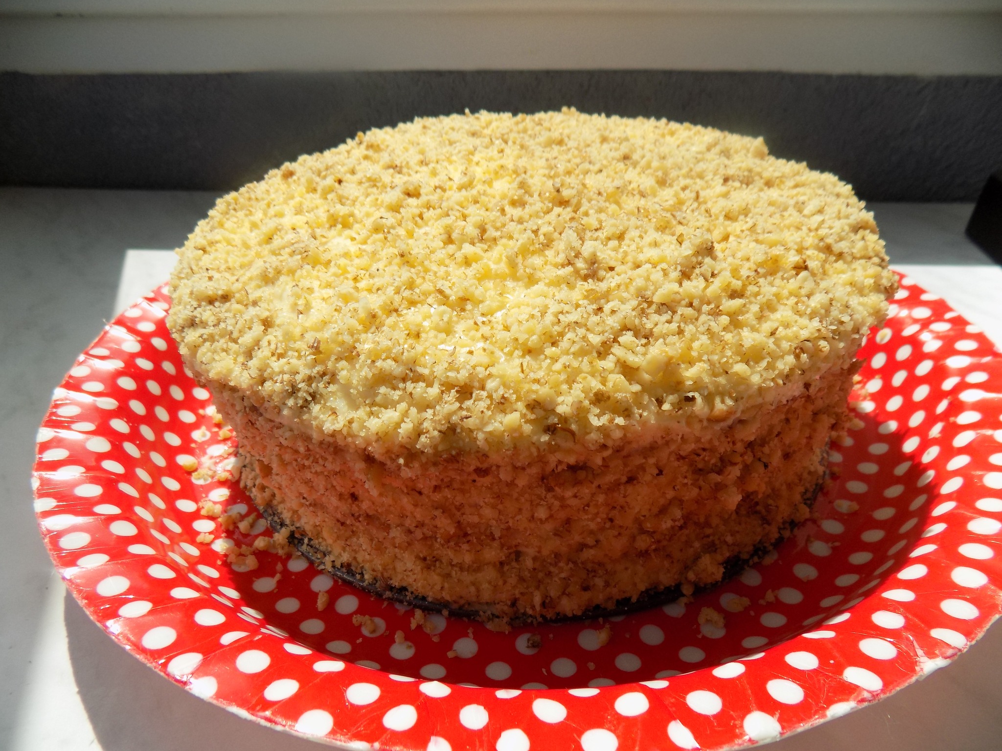 Завършвам десерта, като в ринг слагам единия бял блат и поливам с част от топлия крем, заравнявам. Поставям какаовия блат и над него сипвам отново крем, заравнявам и слагам втория блат. Поливам с останалия крем, заравнявам и поръсвам със смелени орехи.