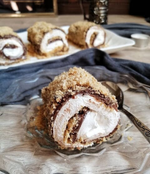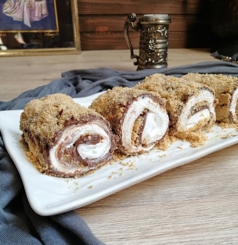 Извадете и с остър нож срежете кората по широчина на две. След това направете общо 6 ленти по дължината на формата за печене. С шпатула повдигнете една лента и навийте на руло. Сложете в съд за сервиране. Повторете с останалите.