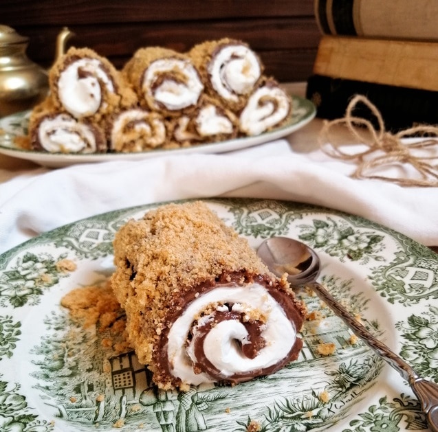 В подходящ съд разбийте сметаната и с нея покрийте кора във формата. Върнете в хладилника за още няколко часа или най-добре за 1 нощ. За да се получи формата на десерта, той трябва да е много добре охладен. За това го оставете колкото с е може по-дълго в хладиилника.