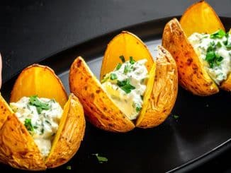 Необходими продукти: 3 едри картофа 40 грама пармезан 1-2 скилидки чесън 40 грама галета щипка риган 2-3 супени лъжици олио 2 супени лъжици царевично нишесте или картофено нишесте 1 чаена лъжичка червен пипер Начин на […]