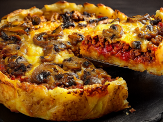 Необходими продукти: За основата: 1,2 килограма картофи растително масло сол на вкус щипка чесън на прах 50 милилитра разтопено краве масло За пълнежа: 200 грама гъби печурки 1 глава лук, нарязана на кубчета 500 грама […]