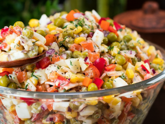 Необходими продукти: 5-6 сварени моркова 8 сварени яйца 1 чушка 1 глава лилав лук 200 грама грах от консерва 200 грама царевица от консерва 200 грама пуешка шунка копър, на вкус За соса: 50 грама […]