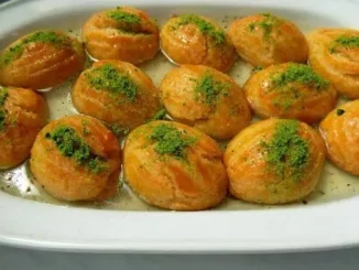 Необходими продукти: 250 грама брашно 75 грама пудра захар 150 грама краве масло 1 бакпулвер 50 грама пшеничен грис 2 яйца 1 жълтък 1 ванилия За сиропа: 500 грама захар 500 милилитра вода сока на […]