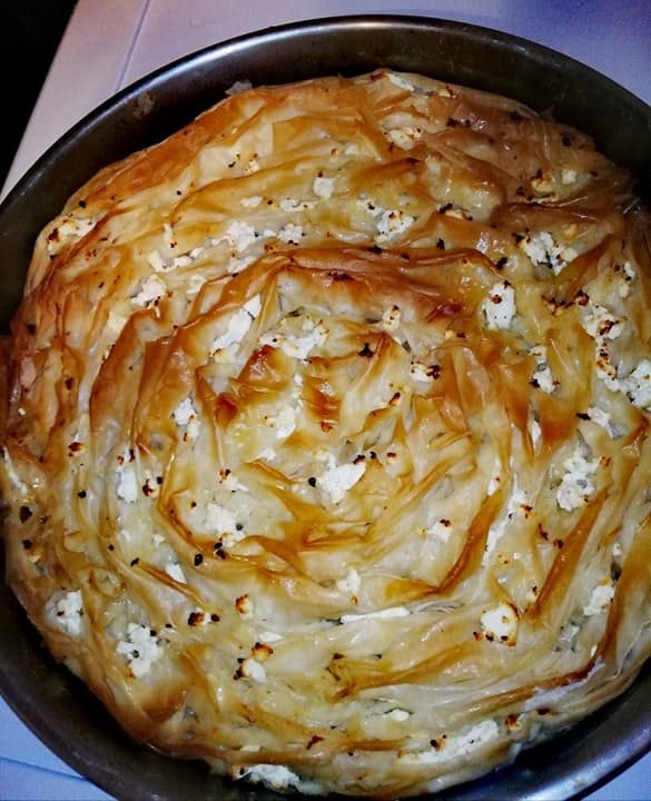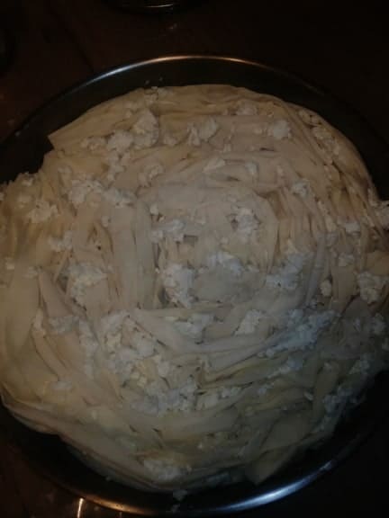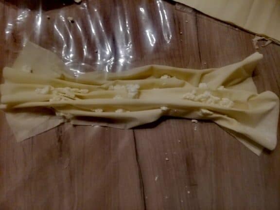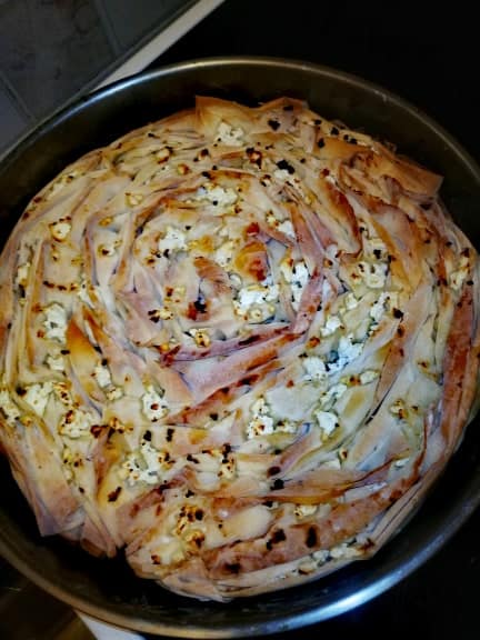 Натрошете сиренето. Вземете две кори за баница и ги поставете върху работна повърхност. Поръсете със сирене и свийте на хармоника, но без да навивате на руло. Завъртете на охлюв и поставете в намазнена форма за печене. Повторете с още две кори. Увийте около охлюва. Направете същото с останалите кори.
