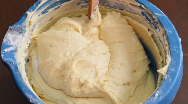 В купа разбийте кравето масло с пудрата захар. Бийте, докато сместа стане хомогенна. Едно по едно добавете яйцата, като не спирате да биете. Сложете ванилията и разбъркайте. Смесете брашното и бакпулвера. Пресейте и добавете към яйчната смес. Заместете тесо. Увийте го в прозрачно фолио и оставете в хладилника за минимум 2 часа.