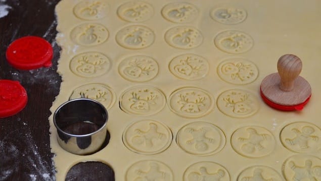 Набрашнете работна повърхност и сложете тестото върху нея. Ако е необходимо, добавете още брашно. Месете, докато тестото спре да лепи. Разточете и изрежете направете печати. След това изрежете.